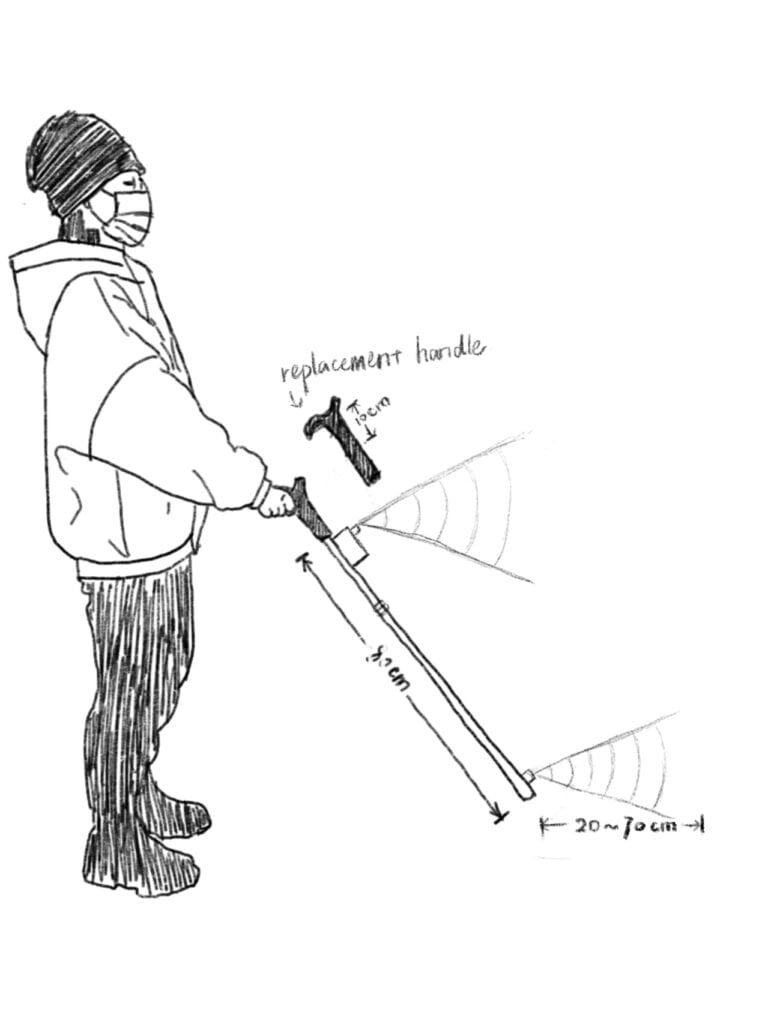 At first, we tried to make the telescopic pole to adjust the length of the stick so that it could fit with people of different heights. However, the 3D printer could not be made a telescopic pole that could slide, so we changed the idea into making the handle in different lengths. These detachable handles can be easily assembled to the stick so that people with different heights can adjust the stick into the one which is suitable for them. The handle is designed in some waves, which is more convenient for people to hold and use it. The battery and switch are installed just below the handle so that people can easily switch on and off this equipment due to their needs.